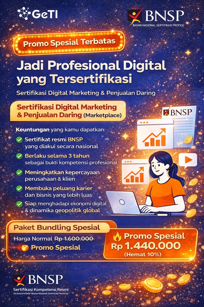 Melalui Program Sertifikasi BNSP bersama GETI, kamu dapat meningkatkan kredibilitas profesional sekaligus memperkuat posisi di dunia kerja maupun bisnis digital.